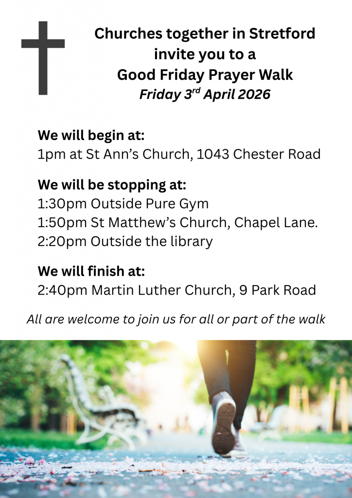Am Karfreitag gibt es in Stretford/Manchester in diesem Jahr etwas Neues: eine ökumenische Ge-betswanderung durch den Stadtteil!