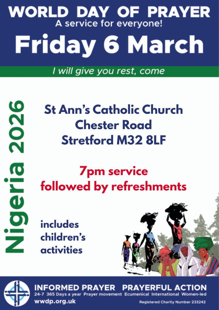 Auch in diesem Jahr feiern wir in Manchester wieder den Weltgebetstag in ökumenischer Verbundenheit. Die Gottesdienstordnung für 2026 wurde von Frauen aus Nigeria entwickelt.